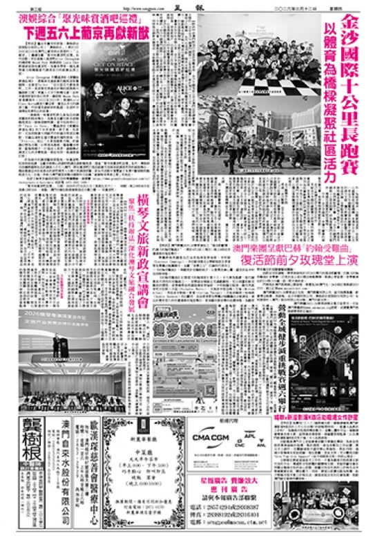 【特訊】由澳門特別行政區政府體育局、金沙中國有限公司及澳門田徑總會攜手主辦的「2026金沙中國澳門國際十公里長跑賽」將於周日(3月15日)隆重舉行。賽事前夕已舉辦一系列社區活動,藉此全城矚目的十公里長跑體育盛事增強社區凝聚力,聯動萬名跑手與大灣區社服機構的運動員攜手參與賽事,秉承及體現「金沙關懷」的社區服務精神,並將之延伸到更多地區,共同構築多元共融社會。