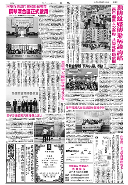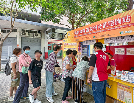 【特訊】隨着本澳即將進入白紋伊蚊活動高峰期,登革熱及基孔肯雅熱(下稱“雙熱”)的傳播風險將會明顯上升,為了加強預防“雙熱”措施滲入社區,預防登革熱工作小組於日前一連兩日在全澳多個區域舉行“預防蚊媒傳染病社區諮詢站”活動,透過“健康社區”計劃進行跨部門合作,落實“資源下沉”政策方向,聯動各界社團機構的力量以發揮協同效應,共築社區防疫網。