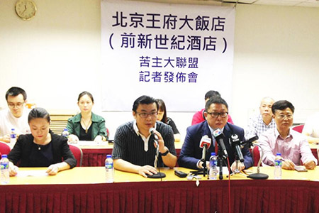 在氹仔的北京王府大飯店苦主大聯盟召開記者會,稱已經聯合了 20多間的旅遊業界及個人,正式聯合向法院提起法律訴訟,追討在氹仔的北京王府大飯店因未履行合約應返還有關苦主的權益超過 9,900萬澳門幣,並要求法院宣告酒店因所簽署的借款抵押及代物清償而業權轉移的公證書無效。