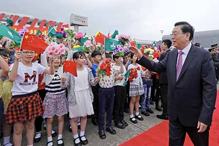 【特訊】中共中央政治局常委、全國人大常委會委員長張德江昨日上午乘坐專機抵達澳門視察,以瞭解澳門最新發展情況。他抵達澳門後,隨即在機場停機坪發表簡短講話。他表示今次來澳的目的,可用「感受、考察、鼓勁」來形容;另外,他表示要轉達國家主席習近平、中央政府、全國各族人民對澳門同胞的親切慰問和良好祝願。