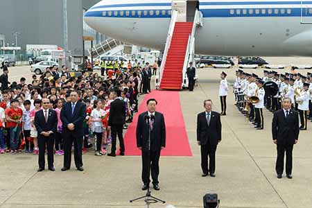 張德江一行乘坐的專機上午11時許抵達澳門國際機場,張德江步下舷梯,先與行政長官崔世安熱切握手,並接受兩名男女小學生獻花,之後沿紅地氈與在場迎接的各主要官員握手。警察銀樂隊在現場奏樂,240名手持國旗、區旗和絹花的高小學生熱烈歡迎,張德江頻向群眾揮手致意。