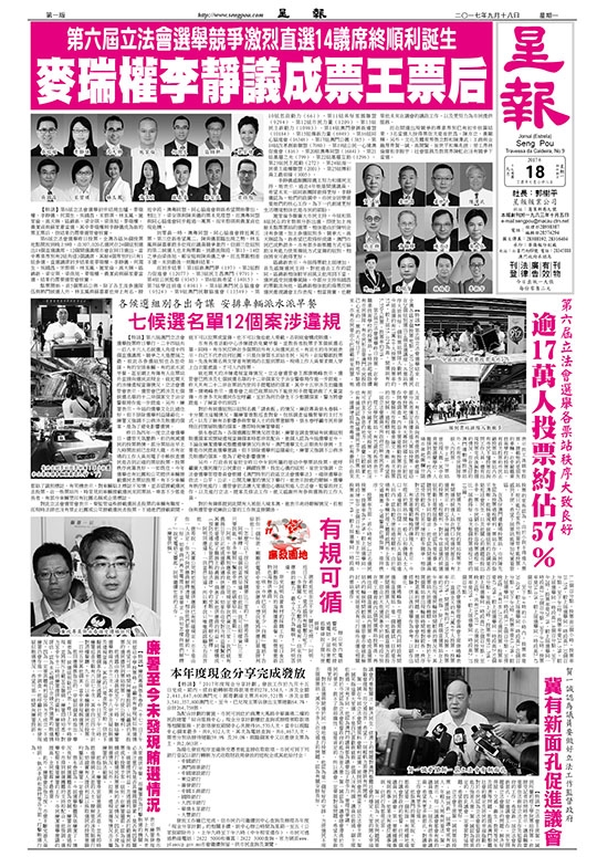 第6屆立法會選舉昨日投票,全澳各區36個投票地點開放到晚上9時,由307,020名選民在24個組別選出14個直選議席。12個間選議席亦會在同日選出,當中專業界別有2組角逐3個議席,其餘4個界別均只有1組參選。直選議席初步結果是麥瑞權、李靜儀、何潤生、吳國昌、宋碧琪、林玉鳳、施家倫、高天賜、區錦新、梁安琪、梁孫旭、麥瑞權、黃潔貞與蘇家豪當選。結果仍需要選管會核實。