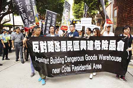 昨午有石排灣居民組織遊行,反對政府設置臨時危險品儲存倉的選址,遊行人士在塔石廣場集合,其後到政府總部遞信。治安警表示,遊行高峰時共約三百人參與,約五十名警員維持秩序。整個遊行活動,秩序良好,過程順利。居民代表則聲稱有五百人參與遊行。