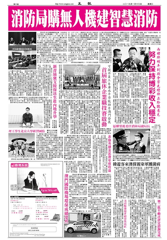消防局局長梁毓森表示,今年消防工作展望將全力配合特區政府智慧政務工作,持續強化防災的準備,提升救援效率,保障前線人員安全和優化內部管理,今年將就智慧消防立項跟進,包括購置兩至三部無人機,用於消防緊急救援,在火災實時偵測了解事故現場狀況,另外,亦考慮建設視覺化管理平台,透過電子地圖顯示實時救援情況、人員車輛定位消防栓及水源分佈位置等。