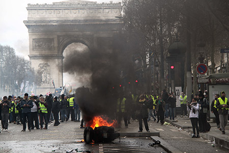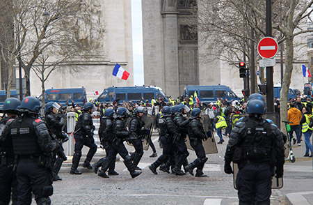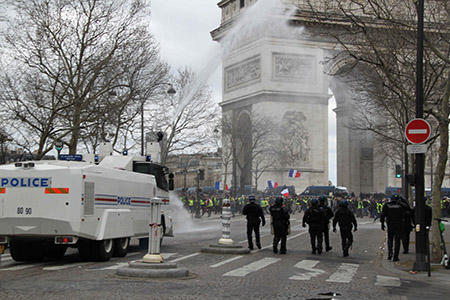 大批示威者當天早上便聚集在凱旋門附近,警方也部署了大批警力。中新社記者在現場看到,有一些暴力示威者試圖衝擊凱旋門,襲擊警察並攻擊警車,被駐守在凱旋門下的防暴警察用催淚瓦斯驅散。