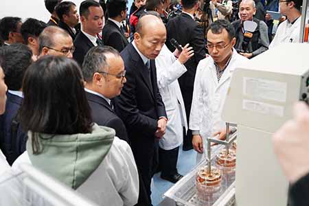 昨日廿四日上午韓國瑜先到訪澳門賽馬會參觀,期後到澳門大學,在澳門大學校長宋永華和中華醫藥研究院院長王一濤王一濤陪同下,參觀了實驗室多項先進儀器,期間又與師生交流,了解澳大校園的設計規劃、人才培養策略和創新研究的發展。