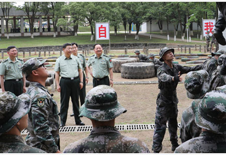 學院訓練場上,一派實戰化練兵景象。習近平走到障礙訓練場旁,察看學員進行障礙訓練情況。極限訓練對於錘煉學員體能極限、意志極限、心理極限,提高戰場適應能力很有意義。習近平步行進入極限訓練場,詳細瞭解有關訓練設施和訓練情況。