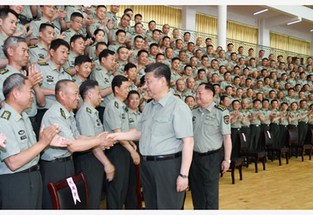 上午10時許,習近平乘車來到陸軍步兵學院。在熱烈的掌聲中,習近平親切接見駐江西部隊副師職以上領導干部和建制團級單位主官、陸軍步兵學院本部正團職以上干部和石家莊校區主官、專家教授代表,同大家合影留念。