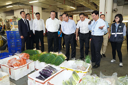 中聯辦主任傅自應、副主任姚堅在市政管理委員會主席戴祖義、副主席李偉農等陪同下,到澳門新批發市場參觀。市政署人員介紹了供澳蔬菜水果的進口及檢驗檢疫的具體工作、批發市場的日常運作以及內地食品進口本澳後須經過的檢驗檢疫程序等。傅自應關注批發市場內的商戶數目及供貨量,並與批發市場內的商戶親切交談,瞭解供應蔬果的貨源及種類等情況。傅自應讚賞批發市場內環境及管理完善,內地供澳的蔬菜水果質量優良。他認為除了供應本地居民日常對鮮活食品的需求,澳門作為世界旅遊休閒中心,旅客量龐大,食品安全把關十分重要。當中供澳的鮮活食品絕大部分來自內地,保持食品和農產品安全、種類及數量穩定,有賴國家長期支持,期望市政署與內地有關部門繼續緊密合作,合力把關,保障本澳的食品安全。
