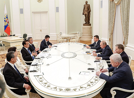 李克強首先轉達習近平主席對普京總統的誠摯問候。李克強表示,中俄互為最大近鄰,今年適逢兩國建交70周年。前不久,兩國元首一致同意將中俄關係提昇為新時代全面戰略協作夥伴關係。我此訪同梅德韋傑夫舉行中俄總理第二十四次定期會晤,全面規劃兩國各領域交往與合作,取得諸多新成果。中俄關係保持健康穩定發展,不僅有利於雙方,有利於地區,也有利於世界。中方願同俄方持續鞏固友誼,深化合作,加強交往,維護以聯合國為核心的國際體系和以世界貿易組織規則為核心的自由貿易體制,這對促進世界發展繁榮與和平穩定具有重要意義。