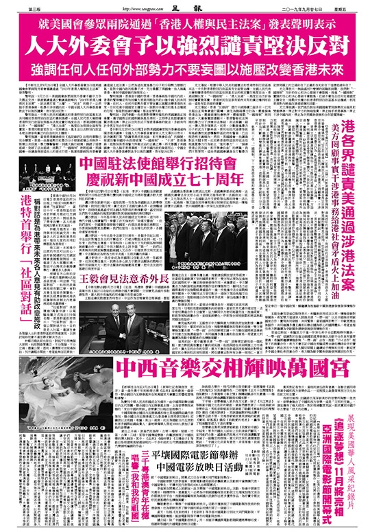 聲明說,9月25日,美國國會參眾兩院外委會不顧中方多次嚴正交涉,執意審議通過少數議員鼓噪的“2019年香港人權與民主法案”。該法案打著“人權”、“民主”的幌子,公然插手香港事務,粗暴干涉中國內政。中國全國人大外事委員會對此予以強烈譴責、表示堅決反對。