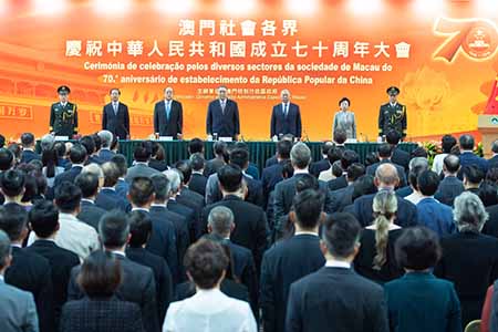【特訊】澳門社會各界慶祝國慶七十周年大會在澳門蛋舉行,行政長官崔世安表示,回歸二十年來,展現了具有澳門特色的「一國兩制」成功實踐,成為了國家治理實踐和成就的有機組成,印證了「一國兩制」是完全行得通、辦得到、得人心的。中聯辦主任傅自應表示,在新時代國家全面開放的今天,要發揮好澳門中西文化交融,對外聯繫廣泛的優勢,運用好基本法賦予澳門開展對外交往的權力,積極配合國家發展戰略和對外政策,在傳播中華優秀文化,講好當代中國故事,展示「一國兩制」成功實踐,促進國際交流合作等方面發揮特殊作用。全國政協副主席何厚鏵指,社會要形成維護澳門社會和諧穩定的強大合力,確保「一國兩制」的實踐在澳門不變形、不走樣,不斷地推進「一國兩制」在澳門的實踐行穩致遠。