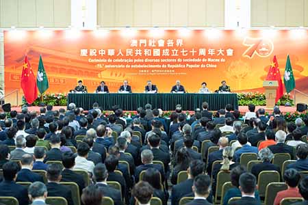 澳門社會各界慶祝中華人民共和國成立七十周年大會昨日在澳門東亞運動會體育館澳門國際會議中心舉行。行政長官崔世安表示,澳門回歸祖國以來,重新納入了國家治理體系,「一國兩制」在澳門特區的實踐彰顯了強大生命力。回歸二十年來,展現了具有澳門特色的「一國兩制」成功實踐,成為了國家治理實踐和成就的有機組成,印證了「一國兩制」是完全行得通、辦得到、得人心的。本屆政府正在全力配合新一屆政府的籌組工作,確保政府換屆交接工作有序圓滿進行,特區各項發展事業繼續平穩推進。