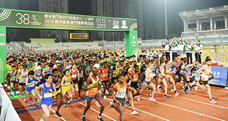 【特訊】由體育局及澳門田徑總會主辦,銀河娛樂集團冠名贊助的「慶祝澳門特別行政區成立二十周年 – 2019銀河娛樂澳門國際馬拉松」昨日(1日)於奧林匹克體育中心運動場舉行,賽事吸引52個國家地區共12,000名運動員角逐,由社會文化司司長譚俊榮等主持起步禮。矚目的馬拉松男、女子全場組別最終分別由埃塞俄比亞的阿比比與肯尼亞的謝妮育奪冠。而陳楷元與許朗則贏得馬拉松澳門運動員男、女子組的桂冠。