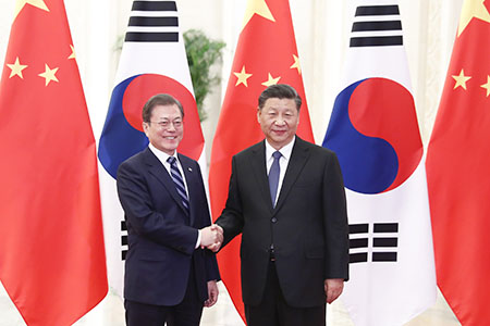 習近平歡迎文在寅來華出席第八次中日韓領導人會議。習近平指出,中韓都是亞洲乃至世界上有分量、有影響的重要國家,兩國在推動雙邊關係實現更好發展、促進地區和平穩定繁榮、捍衛多邊主義和自由貿易體制等方面擁有廣泛共識,一直是緊密合作的朋友和夥伴。過去兩年多來,中韓關係保持了穩定發展的大方向。面對當今世界百年未有之大變局,中韓應深化和發展戰略合作夥伴關係,照顧彼此核心利益和重大關切,推動雙邊關係邁上更高水平。