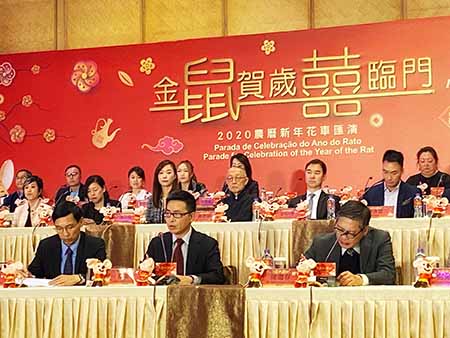 「金鼠賀歲囍臨門 2020農曆新年花車匯演」(簡稱:花車匯演)由旅遊局主辦,市政署、文化局及體育局協辦,亞洲旅遊交流中心贊助,大會昨日(八日)舉行記者招待會介紹詳情。旅遊局代局長程衛東、副局長許耀明、亞洲旅遊交流中心助理主任李文沛、文化局副局長陳繼春、市政署文康及公民教育廳廳長高佩珊、體育局體育設施管理廳廳長何華,以及支持單位與贊助機構的代表出席。