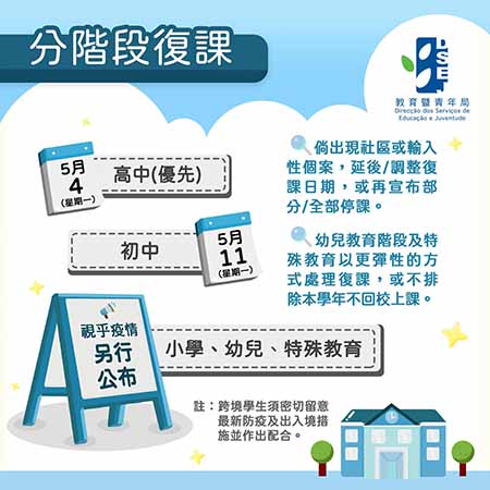 因應新冠肺炎疫情在本澳蔓延,非高等教育學校於農曆年假後一直停課,至今已逾兩個月。昨日教青局公布復課新預案,五月四日高中教育階段復課、初中教育階段則於五月十一日復課,小學、幼兒教育和特殊教育將視乎中學復課後和疫情的變化再決定具體日期。其中幼兒及特殊教育會考慮以更彈性的方式處理,不排除本學年不回校上課。