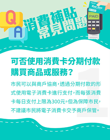 市民可以與商戶協商,透過分期付款的形式使用電子消費卡進行支付,而每張消費卡每日支付上限為300元。但為保障市民,不建議市民將電子消費卡交予商戶保管。