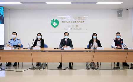 昨日新型冠狀病毒感染應變協調中心舉行例行記者會,仁伯爵綜合醫院醫務主任羅奕龍、旅遊局執照及監察廳廳長陳露、治安警察局公共關係處處長李德輝、疾病預防控制中心傳染病防制暨疾病監測部協調員梁亦好、中國國際應急醫療隊(澳門)醫療組組長兼仁伯爵綜合醫院急診部醫生繆智豐共同會見傳媒。