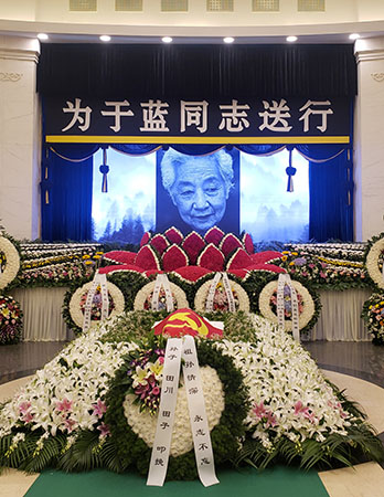 當日于藍的遺體靜靜地躺在禮堂正中,身上披著一面鮮紅的黨旗,四周擺滿了社會各界敬獻的花圈、挽聯。