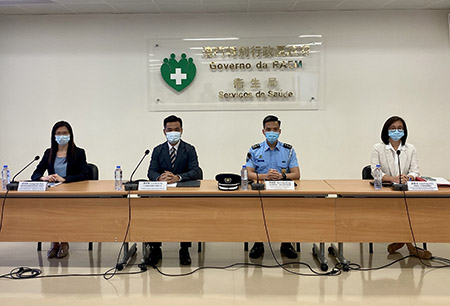 昨日新型冠狀病毒感染應變協調中心舉行例行記者會,仁伯爵綜合醫院醫務主任羅奕龍、治安警察局行動及通訊處處長馬超雄、旅遊局公共關係處處長劉鳳池、疾病預防控制中心傳染病防制暨疾病監測部協調員梁亦好共同會見傳媒。