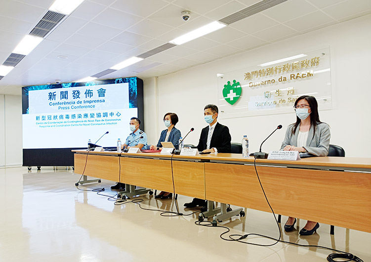 新型冠狀病毒感染應變協調中心昨日舉行例行記者會,衛生局疫苗接種協調員戴華浩、旅遊局傳播及對外關係廳廳長劉鳳池、治安警察局行動及通訊處處長馬超雄、疾病預防控制中心傳染病防制暨疾病監測部協調員梁亦好共同會見傳媒。
