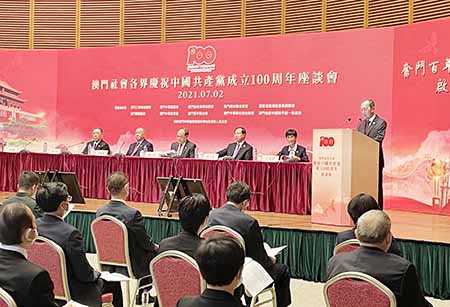 澳門社會各界於昨日在澳門科學館隆重舉辦慶祝中國共產黨成立一百周年座談會,熱烈慶祝中國共產黨成立100周年,學習貫徹習近平總書記在慶祝中國共產黨成立100周年大會上的重要講話精神。行政長官賀一誠、全國政協副主席何厚鏵、中央人民政府駐澳門特別行政區聯絡辦公室主任傅自應出席會議並講話,崔世安先生,外交部駐澳門特派員公署特派員劉顯法,中國人民解放軍駐澳門部隊司令員徐良才、政委孫文舉,中央駐澳機構負責人、澳門特別行政區主要官員、澳門社會知名人士及澳門社團代表共約一百四十人出席。
