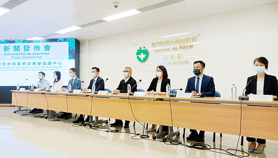 新型冠狀病毒感染應變協調中心昨日舉行記者會,衛生局局長羅奕龍、警察總局局長助理王健、社會工作局副局長許華寶、仁伯爵綜合醫院醫務主任戴華浩、教青局非高等教育廳廳長黃嘉祺、旅遊局公共關係處處長藍同好、治安警察局公共關係處處長李德輝、疾病預防控制中心傳染病防制暨疾病監測部協調員梁亦好共同會見傳媒。