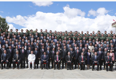西藏自治區黨委書記吳英傑、自治區人大常委會主任洛桑江村、自治區人民政府主席齊扎拉等在機場列隊歡迎。約500名各族各界代表身著節日盛裝,揮動五彩花束,跳起歡快的民族舞蹈,向來自北京的貴客敬獻哈達、青稞酒和象徵五榖豐登的切瑪。