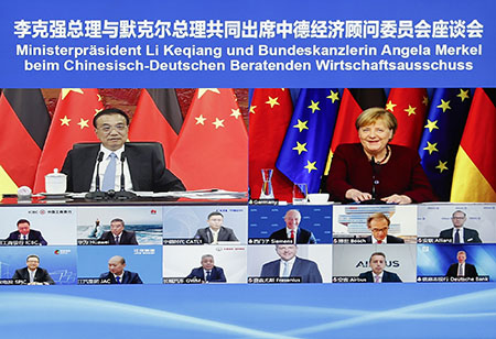 【中新社北京10月19日電】中國國務院總理李克強10月18日下午在中南海紫光閣與德國總理默克爾以視頻方式共同出席中德經濟顧問委員會座談會,並同與會代表交流。