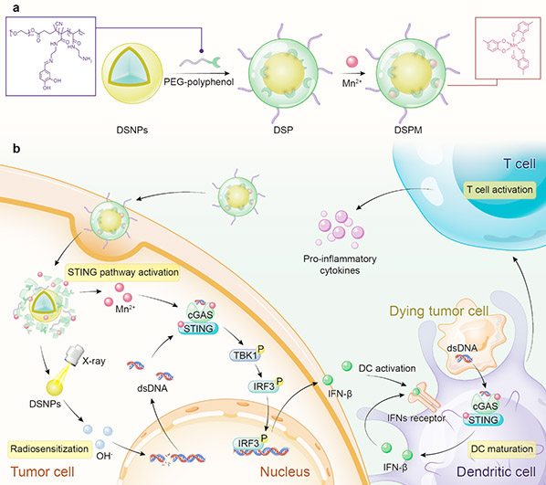 近年來,免疫療法的興起改變了癌症治療的模式,然而腫瘤微環境中淋巴細胞浸潤不夠,促使腫瘤變「冷」,導致免疫療法的療效不高。最新研究結果表示,干擾素基因刺激因子(stimulator of interferon genes,STING)通路的激活能啟動抗腫瘤天然免疫應答,使「冷」腫瘤轉化為「熱」腫瘤,從而提高腫瘤患者對免疫療法的療效。傳統的放射治療能誘導胞質dsDNA的形成,進而激活STING通路;此外,單獨的錳離子也可作為STING通路的激活因子,因此,團隊利用化學合成的多酚衍生物與多種金屬離子配位,構建新型金屬—多酚網絡DSPM,以激活腫瘤微環境STING通路,助力腫瘤放射治療。