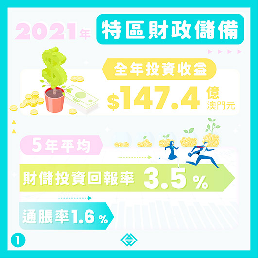 【特訊】金融管理局表示,2021年,澳門特區財政儲備採取審慎的投資管理,全年錄得147.4億(澳門元,下同)投資收益,年度回報率為2.3%。過去五年,財儲的平均年回報率為3.5%,同期的平均年度通貨膨脹率為1.6%。