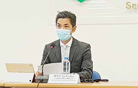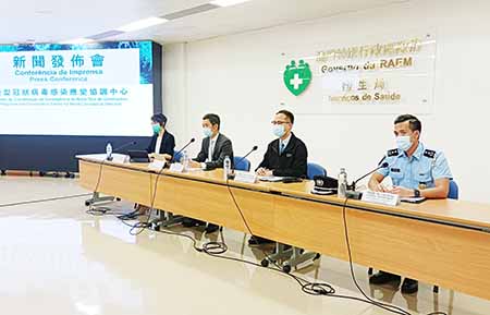 新型冠狀病毒感染應變協調中心昨日舉行記者會,仁伯爵綜合醫院醫務主任戴華浩、旅遊局公共關係處處長藍同好、警察總局警務聯絡及公共關係處處長張健欣、治安警察局行動及通訊處處長馬超雄共同會見傳媒。