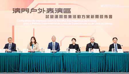 澳門戶外表演區試營運期徵集活動方案新聞發佈會,於昨日早上在澳門文化中心會議室舉行。文化局局長梁惠敏、警察總局局長助理梁文照、治安警察局副局長梁慶康、旅遊局旅遊產品及活動廳廳長司徒琳麗、土地工務局城市建設廳廳長劉國權及交通事務局交通規劃及建設廳廳長林志劍出席。