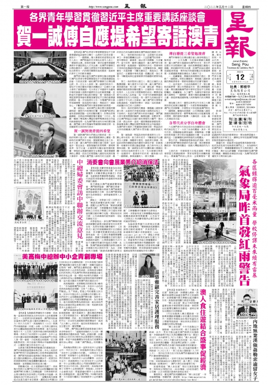 澳門青年聯合會及澳門中華學生聯合總會舉行澳門各界青年學習貫徹習近平主席重要講話座談會,行政長官賀一誠和澳門中聯辦主任傅自應出席,共一百五十人參與。賀一誠發言時表示,習近平主席在慶祝中國共青團成立一百週年大會上發表了重要講話,充分肯定了中國青年為實現中華民族偉大復興中國夢所作出的重要貢獻,並對當代中國青年提出殷切期望。賀一誠寄語大家要認真學習領會和貫徹落實習近平主席的重要講話精神,進一步加強青年工作,引導澳門青年築牢家國情懷,肩負起時代重任,勇毅前行,提振信心,不斷開創澳門青年事業發展的新局面。