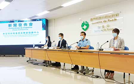 新型冠狀病毒感染應變協調中心昨日舉行記者會,仁伯爵綜合醫院醫務主任戴華浩、旅遊局公共關係處處長藍同好、治安警察局行動及通訊處處長馬超雄和疾病預防控制中心傳染病防制暨疾病監測部協調員梁亦好共同會見傳媒。