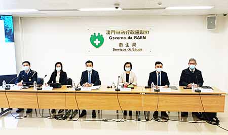 新型冠狀病毒感染應變協調中心昨日舉行記者會,衛生局局長羅奕龍、旅遊局傳播及對外關係廳廳長劉鳳池、教育及青年發展局非高等教育廳廳長黃嘉祺、社會工作局社會互助廳廳長蔡兆源、治安警察局公共關係處處長李德輝和衛生局疾病預防及控制中心傳染病防控處處長梁亦好共同會見傳媒,介紹最新疫情及本澳各項防控措施。