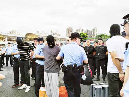 昨日下午六時,兩地警方在拱北口岸及澳門關閘之間的車道地點進行移交。現場所見,兩地警方合共派出過百名警員,荷槍實彈,換錢黨被鎖上手扣押上內地公安警車。