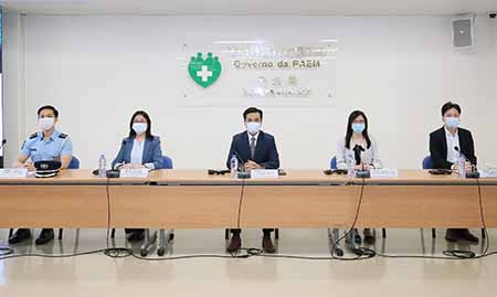 昨日新型冠狀病毒感染應變協調中心舉行例行記者會,仁伯爵綜合醫院醫務主任羅奕龍、旅遊局執照及監察廳廳長陳露、教育暨青年局中學暨技術職業教育處處長梁怡安、治安警察局公共關係處處長李德輝、疾病預防控制中心傳染病防制暨疾病監測部協調員梁亦好共同會見傳媒。