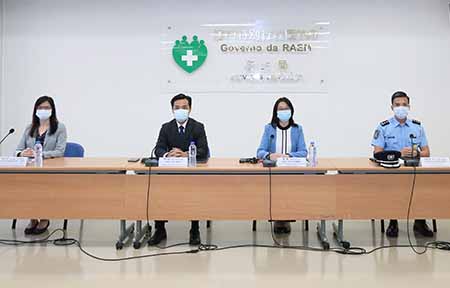 昨日新型冠狀病毒感染應變協調中心舉行例行記者會,仁伯爵綜合醫院醫務主任羅奕龍、旅遊局執照及監察廳廳長陳露、治安警察局行動及通訊處處長馬超雄、疾病預防控制中心傳染病防制暨疾病監測部協調員梁亦好共同會見傳媒。