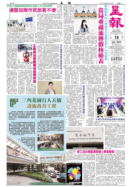 【特訊】昨日早上六時起,合資格人士完成核酸採檢二十四小時後,且檢測結果為陰性方能往來珠澳。截至昨午四時,所有口岸有一百六十一人手持的採樣證明未滿二十四小時,他們需到指定地點或氹仔客運碼頭作醫學觀察。對於流傳珠海有人兜售已蓋章的核酸檢測表,衛生局稱留意到相關情況,當局非常重視,並已向珠海方面了解事件是否屬實。另外,逾四百名海外留學生表達希望回澳的意願,當中大部分計劃六至八月回澳,當局稱會根據情況提供協助。