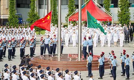 特區政府於昨日早上八時在金蓮花廣場舉行隆重的國慶日升旗儀式,儀式由行政長官賀一誠主禮。儀式開始前賀一誠在保安司司長黃少澤的陪同下步入金蓮花廣場,接受儀仗隊的敬禮。國旗及區旗冉冉升起,約一百名本澳中學生在升旗儀式上高唱國歌,場面莊嚴。