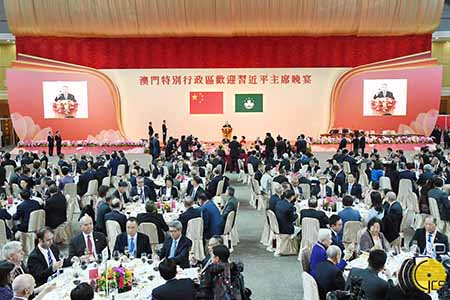 行政長官崔世安致辭時,首先代表澳門特別行政區政府和廣大澳門同胞,向習主席和夫人,以及中央政府代表團致以熱烈的歡迎和崇高的敬意。他說,澳門回歸祖國二十年來,跟隨國家發展的步伐,搭乘國家發展的快車,實現了自身更快更好的發展,各項事業取得了全面進步,取得的成就有目共睹。受益於祖國的發展強大,澳門本地經濟取得長足發展,就業市場保持穩定,公共財政持續錄得盈餘,特區政府全面展開以六大長效機制為主軸的施政部署,努力增進社會福祉,確保居民共享經濟發展成果。近年特區政府實施了土地儲備政策,為澳門長遠的民生改善和社會發展打下良好基礎。