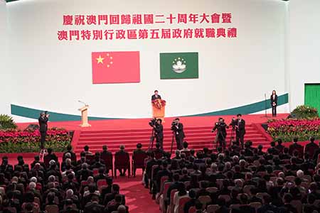 國家主席習近平昨日出席第5屆特區政府就職禮,並發表重要講話。習近平首先指出,澳門回歸祖國20年來,以憲法和澳門基本法為基礎的憲制秩序牢固確立,治理體系日益完善;經濟實現跨越發展,居民生活持續改善;社會保持穩定和諧,多元文化交相輝映。