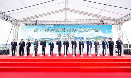 【特訊】澳門國際機場專營股份有限公司(CAM)於昨(22)日在澳門國際機場舉行機場擴建填海工程動工儀式。澳門特別行政區行政長官賀一誠、中央人民政府駐澳門特別行政區聯絡辦公室主任鄭新聰、外交部駐澳門特派員劉顯法、立法會主席高開賢、運輸工務司司長羅立文、中國交通建設集團有限公司執行董事兼總裁王海懷、中國民用航空局副局長梁楠、澳門民航局局長潘華健、CAM董事會主席馬有恆、澳門旅遊娛樂股份有限公司代表何超鳳、執行委員會主席陳穎雄、執行董事朱丹寧、簡焯坤、李時泰以及梁以恆作為主禮嘉賓,與行政會、立法會、各相關政府部門代表,以及機場營運單位和項目顧問與施工單位的代表等逾百人一同見證澳門國際機場擴建填海工程正式動工。