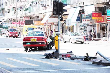 肇事的士車頭凹陷,安全島上的交通燈和指示牌被撞毀,現場雜物散落一地,地上留有血跡。
