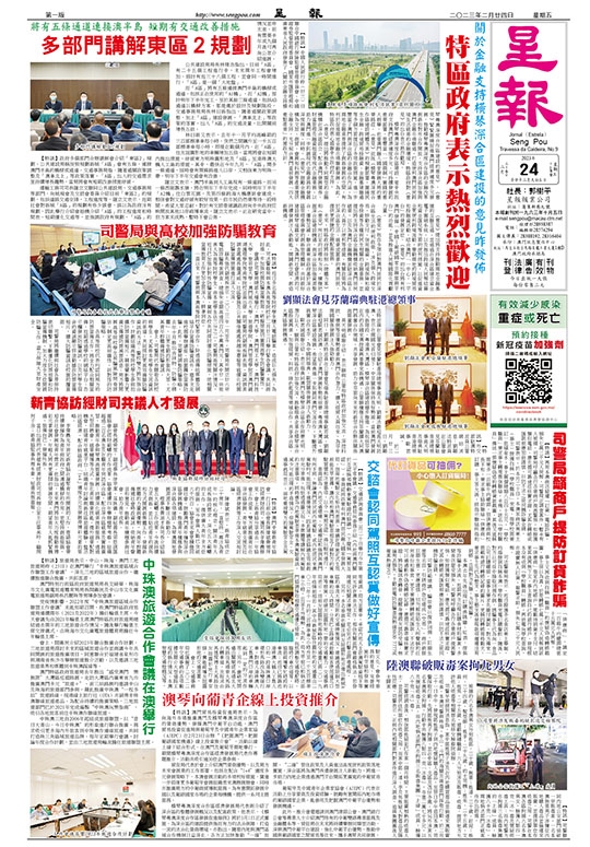 【特訊】中國人民銀行昨(廿三)日聯合中國銀行保險監督管理委員會、中國證券監督管理委員會、國家外匯管理局和廣東省人民政府發佈了《關於金融支持橫琴粵澳深度合作區建設的意見》。《意見》緊緊圍繞促進澳門經濟適度多元發展,推動橫琴粵澳深度合作區的金融改革創新和對外合作開放,支持深合區加強與澳門金融市場聯通,打造便利澳門居民跨境生活就業的金融環境。特區政府對《意見》的出台表示熱烈歡迎。