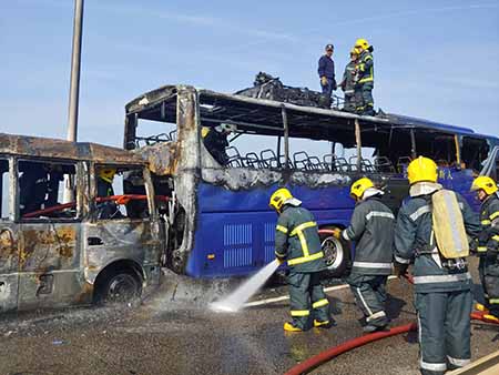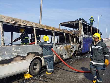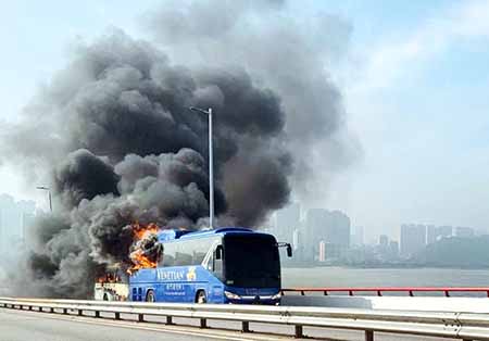 【特訊】友誼大橋氹仔往澳門方向昨日早上發生嚴重交通意外,一輛小型旅遊巴與一部賭場發財巴懷疑追尾相撞後起火焚毁,一名旅遊巴女司機腳部受傷受傷,仍然留院,事發後友誼大橋一度全線封閉。交通事務局消防稱,肇事兩輛旅遊巴已通過二零一九年的年度檢查;消防局表示,涉事的發財巴為天然氣車輛;治安警初步懷疑事故原因是由追尾引起,正查明肇事原因。