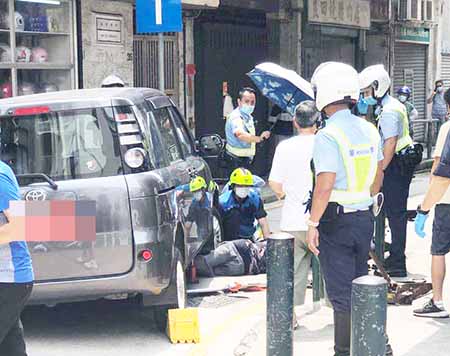 事發於昨日早上約十一時二十三分,一部沿沙欄仔街右轉往海邊新街的輕型汽車,當駛至近門牌三十一號右轉彎位時,懷疑撞倒一名五十九歲正推著手推車的本澳男子,傷者被撞倒後,更被捲入車底,雙腳被前胎壓傷被困。治安警和消防到場,消防用工具協助救出傷者,發現他右大腿及右腳踝骨折、右小腿裂傷及頭顱裂傷有腦脊液流出,意識模糊,立即將其送往醫院搶救。