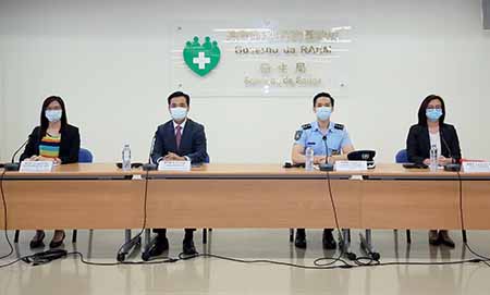 昨日新型冠狀病毒感染應變協調中心舉行例行記者會,仁伯爵綜合醫院醫務主任羅奕龍、治安警察局公共關係處處長李德輝、旅遊局公共關係處處長劉鳳池、疾病預防控制中心傳染病防制暨疾病監測部協調員梁亦好共同會見傳媒。